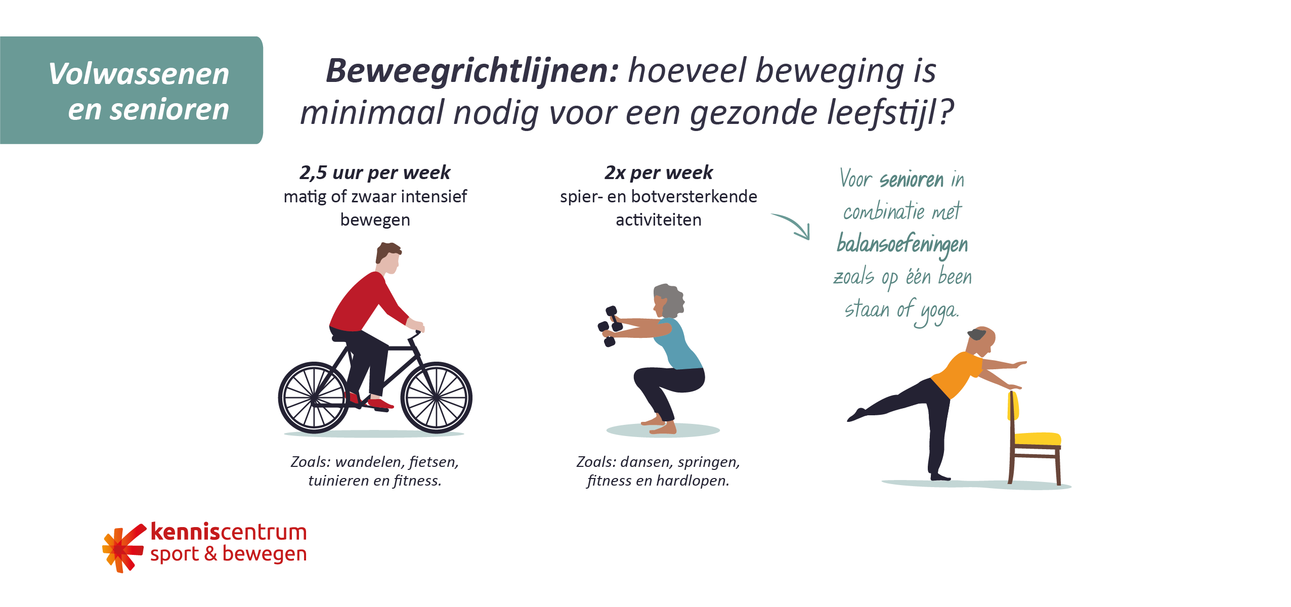 - Doe minstens tweemaal per week spier- en botversterkende activiteiten, voor senioren gecombineerd met balansoefeningen.